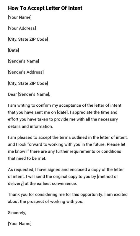 Web how to accept letter of intent [your name] [your address] [city, state zip code] [date] [sender's name] [sender's address] [city,. Web what is a letter of acceptance? Greeting or salutation the greeting or salutation is professional and can follow formal greeting formats.