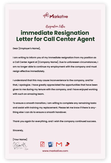 “immediate resignation letter sample for call center agent” “dear ms. Web 233 senator avenue. A salutation you'll likely need to send your resignation letter to your direct manager or human resources.